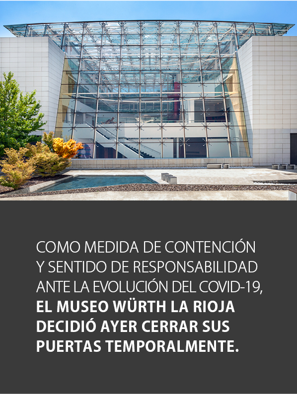 Como han realizado otras instituciones culturales en España y en La Rioja, el Grupo Würth y el Museo Würth La Rioja decidió el jueves 12 de marzo cerrar sus puertas al público temporalmente, la medida ha entrado en vigor hoy viernes, 13 de marzo de 2020. Ante la evolución del COVID-19, el Museo Würth La Rioja ha tomado esta decisión como medida de contención y atendiendo a su responsabilidad frente a la posible propagación del virus, entre sus visitantes y trabajadores.